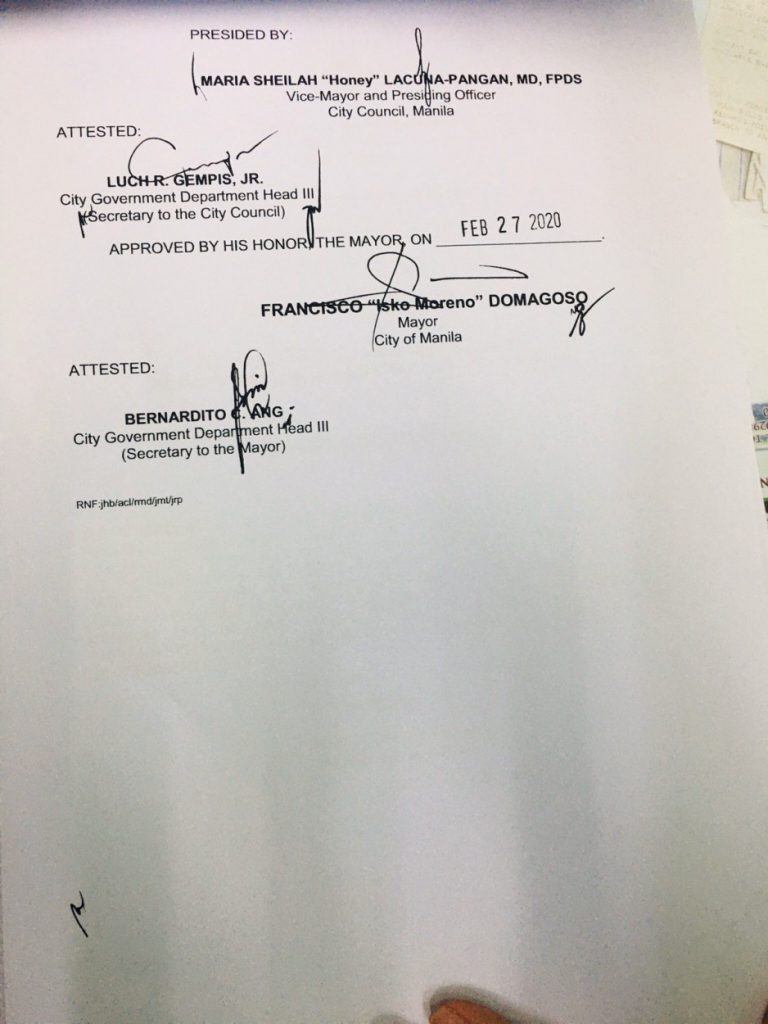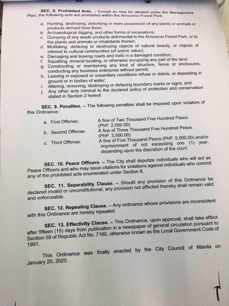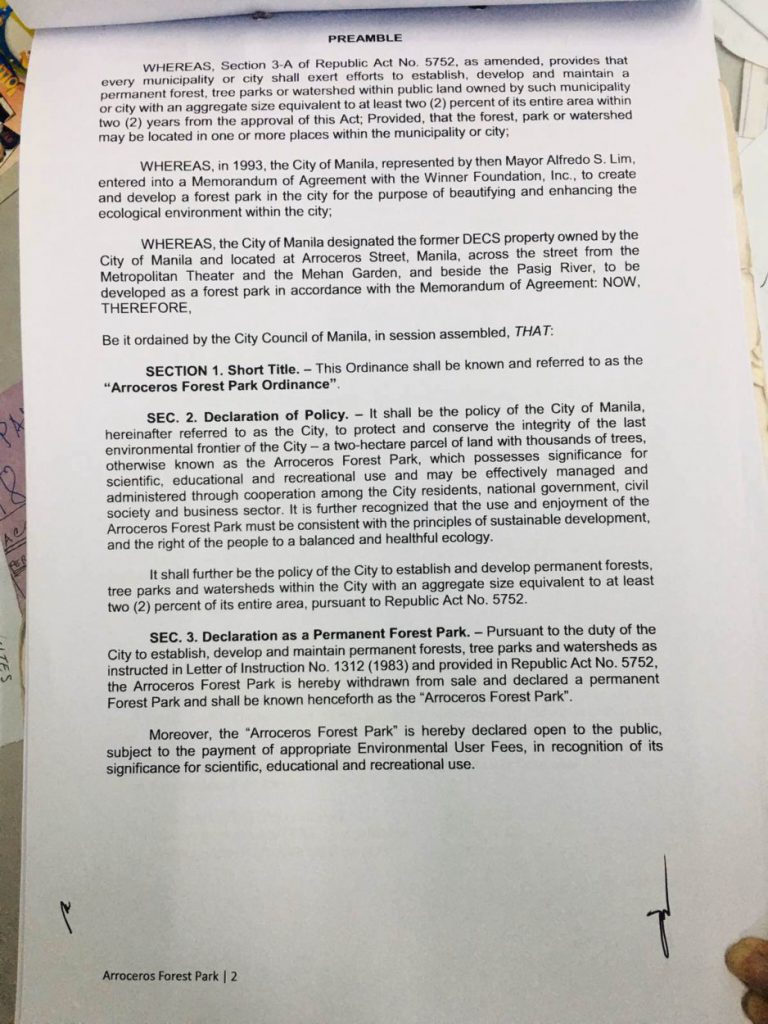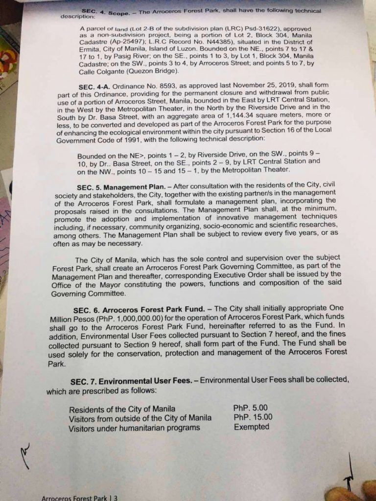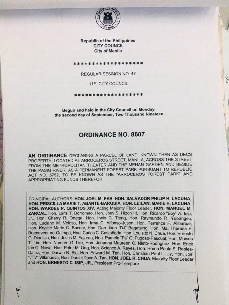 Pinirmahan ni Manila Mayor Franciso”Isko”Moreno noong nakaraang Huwebes, February 27, ang Ordinance No. 8607 o mas kilala sa Arroceros Forest Park Ordinance, na nagdedeklara na ang bahagi ng lupa sa kahabaan ng Arroceros ay isang nang “permanent forest park” mula sa pagiging “property” lamang.