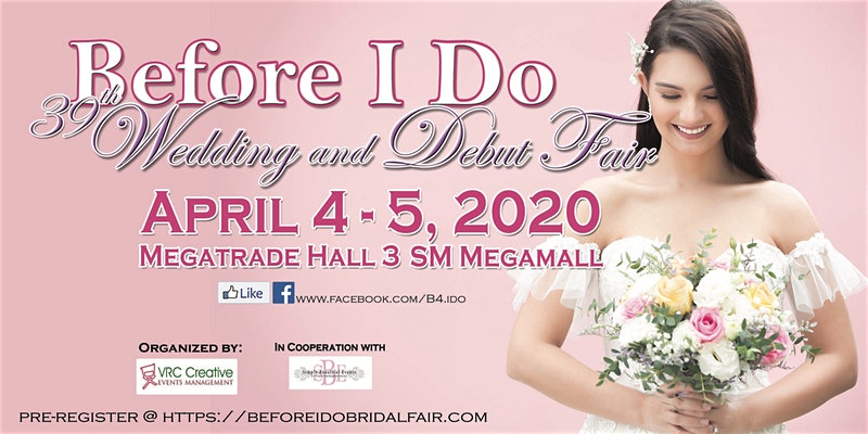 Sat, Apr 4, 2020, 11:00 AM – Sun, Apr 5, 2020, 8:30 PM PST Megatrade Hall 3 EDSA Cor. Julia Vargas Avenue 5th Floor Summit, Bldg B, SM Megamal Mandaluyong, NCR 1550 Come and visit Before I Do – Wedding ...