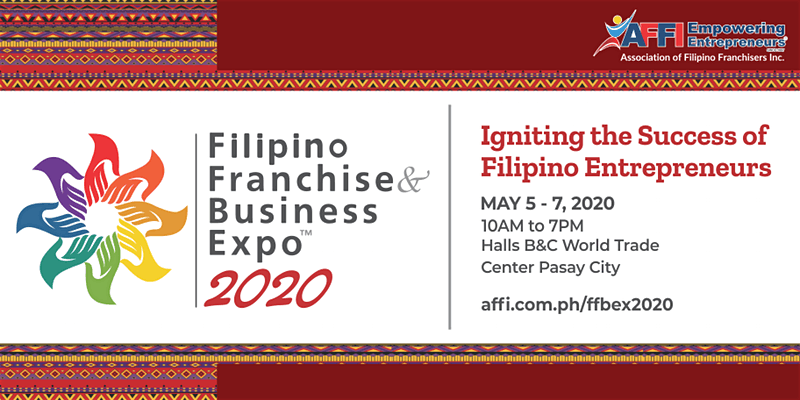 Association of Filipino Franchisers Inc. Tue, May 5, 2020, 10:00 AM – Thu, May 7, 2020, 11:00 PM PST World Trade Center Sen. Gil J. Puyat Avenue Pasay, NCR Filipino Franchise & Business Expo 2020.Showcasing the Filipino Entrepreneurs at their ...