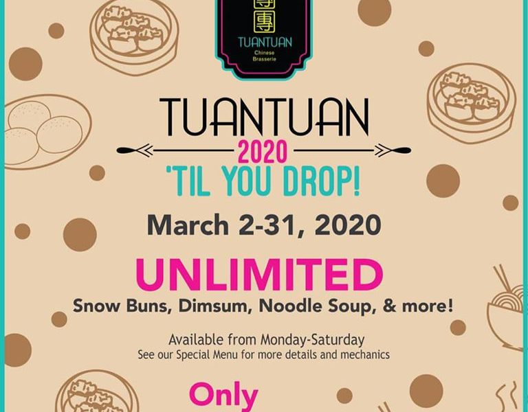 March 2-31, 2020TuanTuan Stores Nationwide Enjoy unlimited Pork Buns, Dimsum & other delicious HK comfort food as TuanTuan brings back TUANTUAN TILL YOU DROP 2020! Beginning March 2 you can now treat yourself to all your favorite TuanTuan dishes for ...