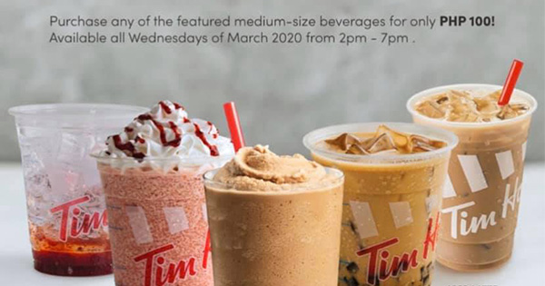All Wednesdays of March 20202pm-7pm Tim Hortons’ newest promo will make you stay cool this March! Try their featured medium size beverage for only Php 100! Available every Wednesday from 2pm – 7pm. See you there! *Promo valid for dine-in ...